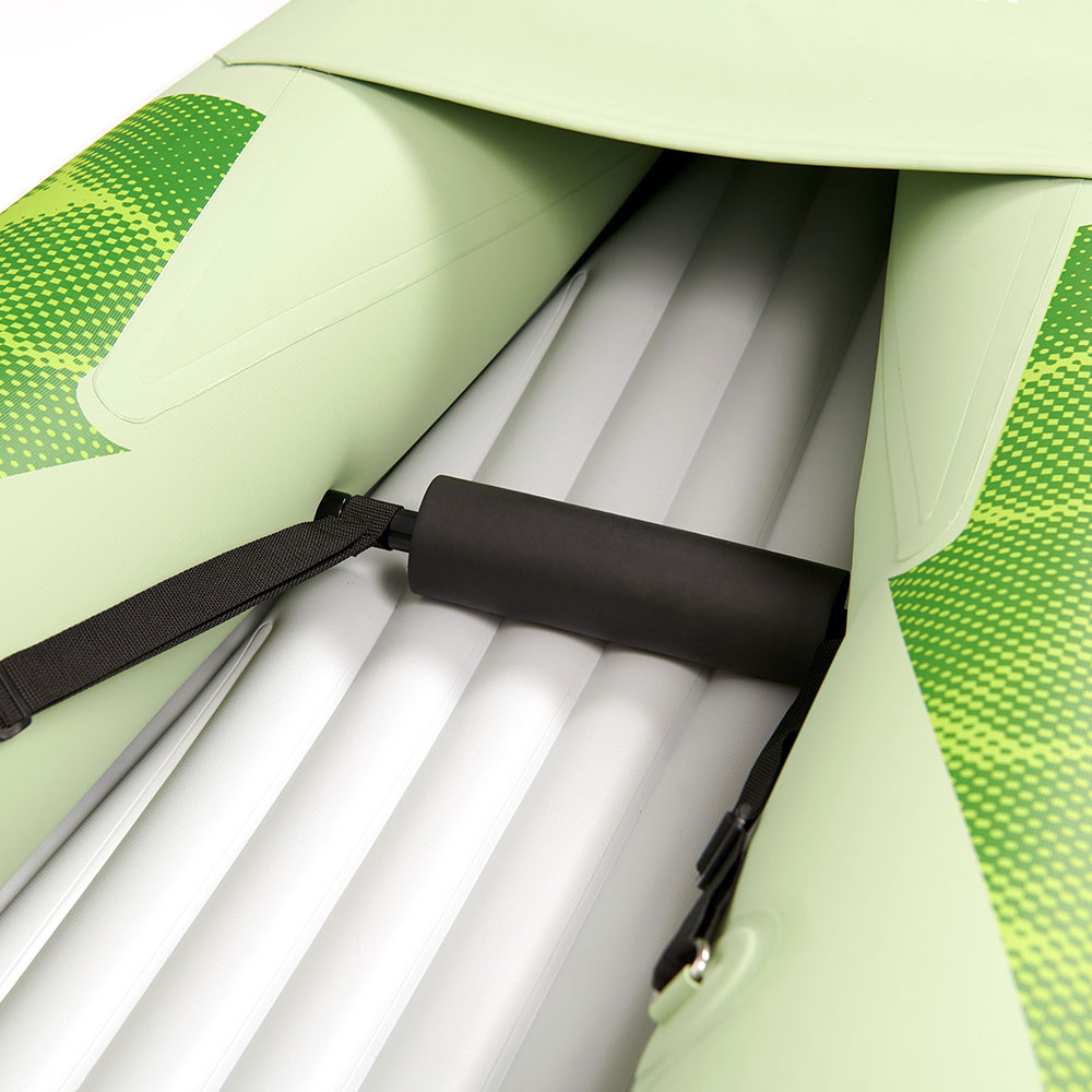 | Der Wellenschutz schützt Sie vor Wasserspritzern und die gummierten Tragegriffe sind ideal für den Transport Ihres aufgeblasenen Kajaks. |