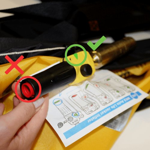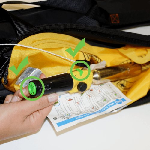 Bitte überprüfen Sie vor jedem Anlegen Ihrer Rettungsweste das Auslösesystem. Stellen Sie sicher, dass die CO2-Flasche nicht durchstochen ist und dass das Nutzungsdatum der Patrone mit der Zellulosetablette nicht überschritten ist. Die Patrone mit der Zellulosetablette darf nur von Hand in die dafür vorgesehene Vorrichtung eingeschraubt werden. Vergewissern Sie sich auch, dass die Vorrichtung zum manuelen Aufpumpen der Rettungsweste unbeschädiht und in einem guten Zustand ist und alle Anzeiger korrekt sind.
