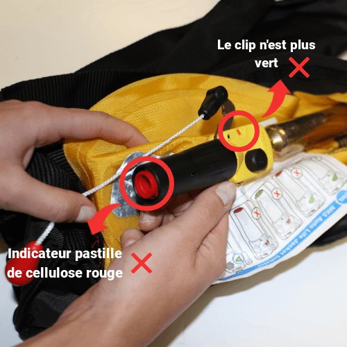 Der Indikator auf der Patrone ist grün, aber der Clip fehlt. Die Rettungsweste wurde manuell ausgelöst, die CO2-Flasche und der Clip müssen ausgetauscht werden. |